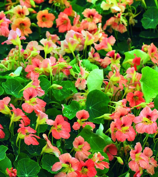 Både blad och blommor går att äta – de passar fint att dekorera sommarens sallader med. Blomsterkrassen blommar rikligt och bjuder in till blomsterpyssel! Foto: Annika Christensen
