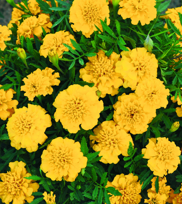 Tagetes går bra att odla i såväl kruka som pallkrage. I en kruka är det dessutom lättare att hålla blommorna från sniglar. På bild sorten ’Strawberry Blonde’. Foto: Annika Christensen