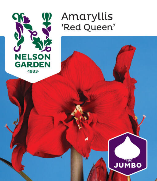 'Red Queen' bjuder på stora kontraster med sina intensivt röda blommor, ljusa inslag och den mörkare stjälken. Den perfekta julgåvan!