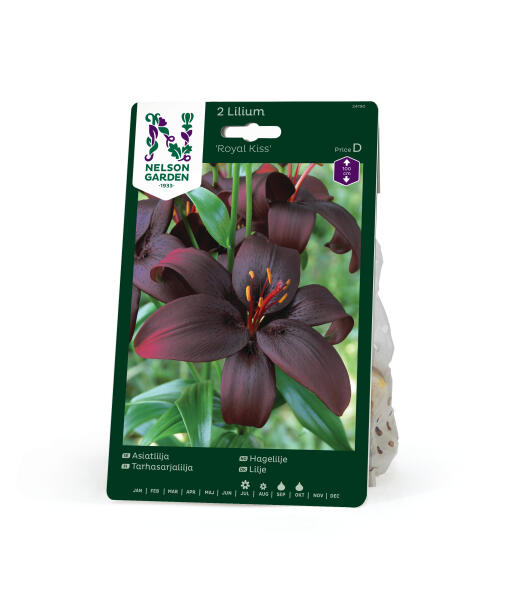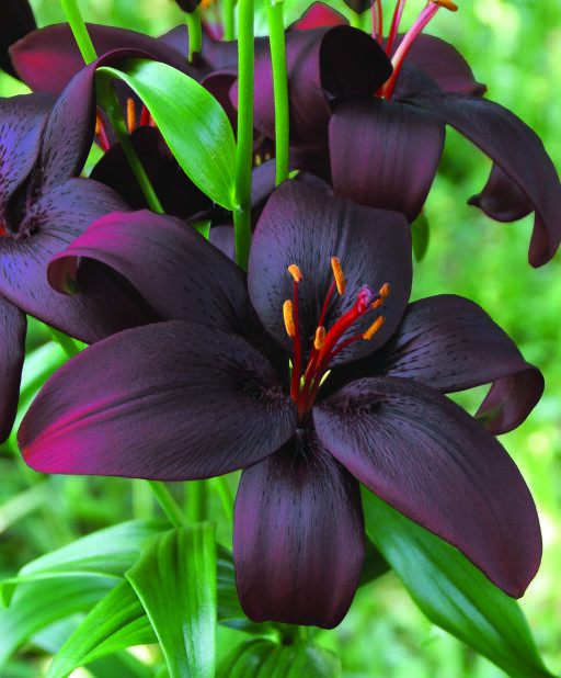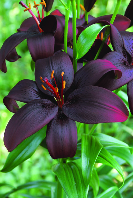 Den här liljan är så mörkt röd att den skulle kunna kallas svart. De skimrande kronbladen är vända uppåt och mot deras mörka fond framträder de bronsfärgade ståndarna i vacker kontrast. En snittblomma som ger tyngd åt buketten.