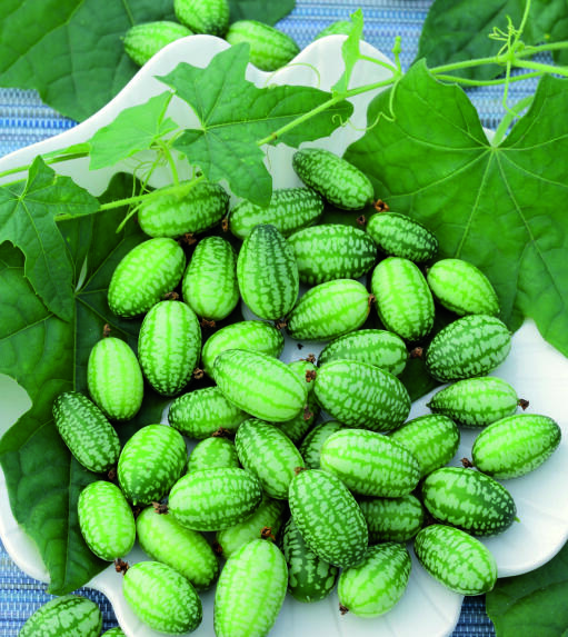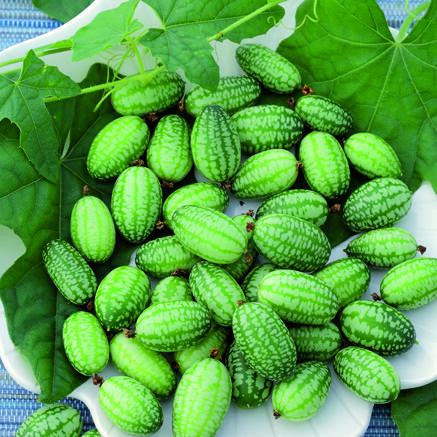 Annorlunda gurkliknande grönsak med mexikanskt ursprung och klängande växtsätt. Ger rikligt med 3 cm långa, randfläckiga frukter. Lämplig i sallader, till inläggningar, i grytor och wok.