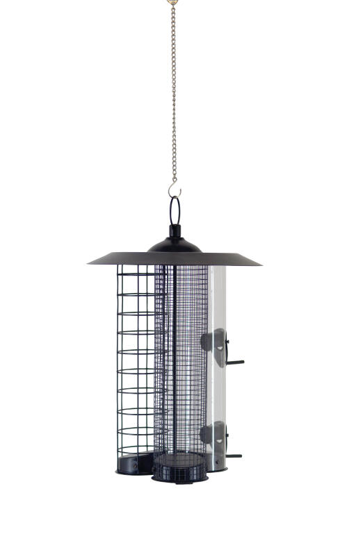 Fåglarnas smörgåsbord. Stor fågelmatare med tre behållare, en för fågelfrö, en för nötter och en för talgbollar (90 g). Varje behållare rymmer ca 1 liter (3 x 1 liter). Av plast och metall. H 34 cm Ø 24 cm.