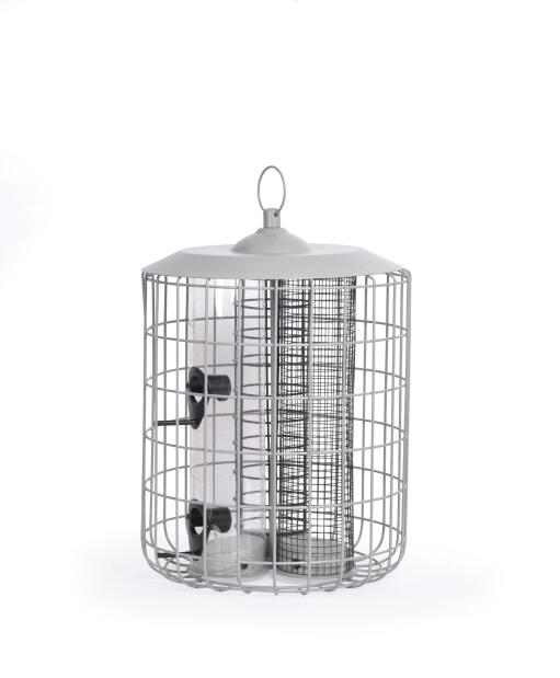 Stor fågelmatare med skyddande galler som utestänger större fåglar. Tre behållare, en för fågelfrö, en för nötter och en för talgbollar (90 g). Varje behållare rymmer ca 1 liter (3 x 1 liter). Av plast och metall. Grå. H 34 cm Ø 24 cm