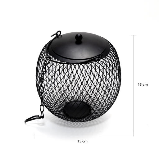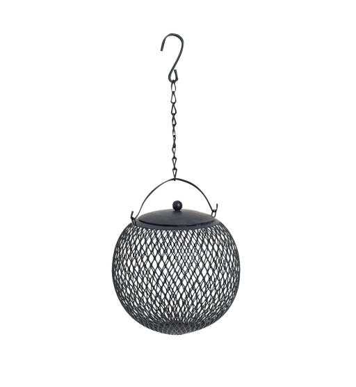 Fågelmatare för nötter i svart metall. Dekorativt rund form. Försedd med lock, bygel och kedja med krok. H 25 cm Ø 15 cm.