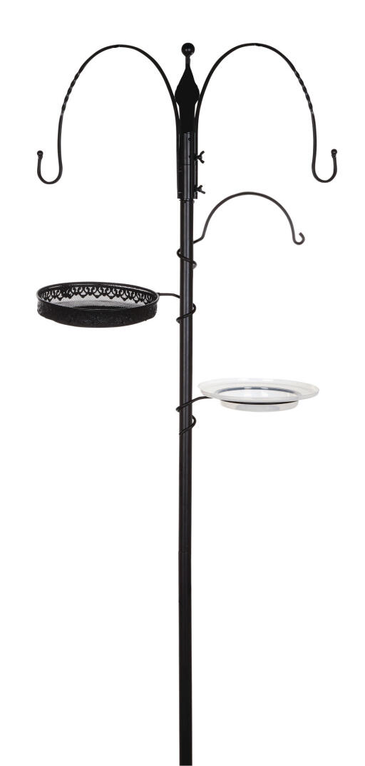 Praktisk ställning för fågelmatare med 3 krokar (2 av krokarna är fasta), fågelbad och foderbrätte med nätbotten. Svart metallstång (fyra delar) monteras till önskad höjd. Stödben medföljer och monteras vid behov. 50 x 247 cm (max. höjd)