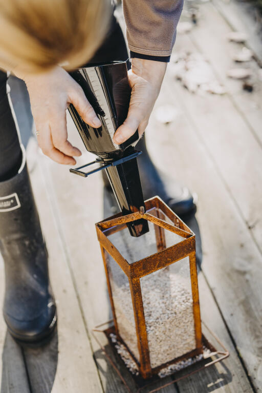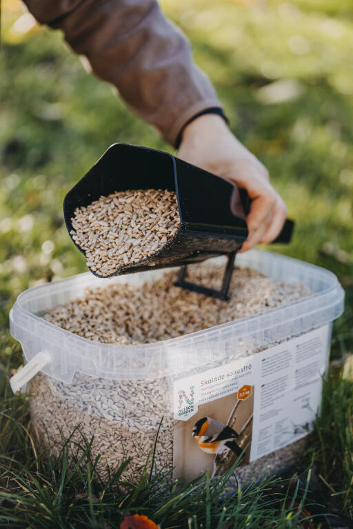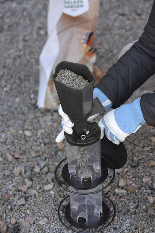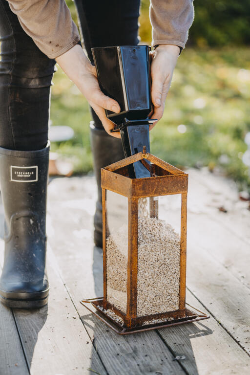 Foderskopa med smart öppna-/stängfunktion som underlättar påfyllning av fågelmat. Passar även i fågelmatare med liten öppning. Polypropen (PP), svart, ca 30 cm lång.