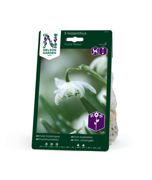En fylld snödroppe vars helvita yttre kalkblad omsluter de inre som alla har gröna spetsar. De här små krinolinliknande skönheterna har tilltalat odlare ända sedan 1731. Anses mindre smaklig för rådjur, hare, kanin och sork.