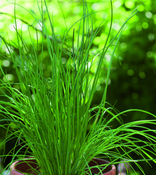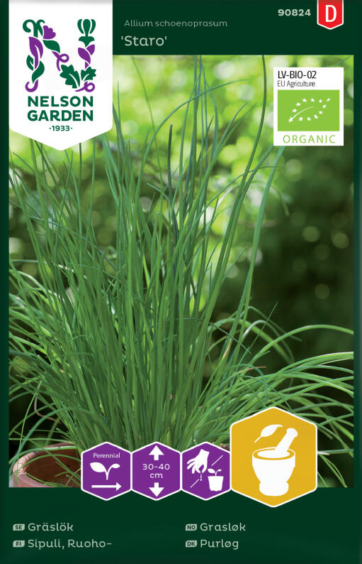 Ekologiskt frö. Denna sort ger smala blad med underbar arom och mild löksmak. Blommar med runda lila blommor. Skörda bladen efter hand och använd dem färska i sallader eller kalla såser. Blommorna går att äta och är vackra att dekorera med.