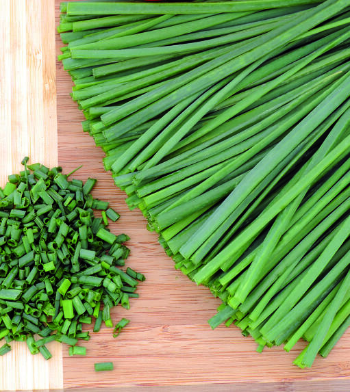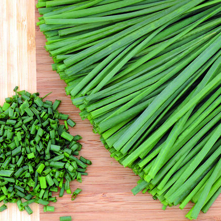 Denna sort ger smala blad med mild löksmak. Blommar med runda lila blommor. Skörda bladen efter hand. Även blommorna går att äta.