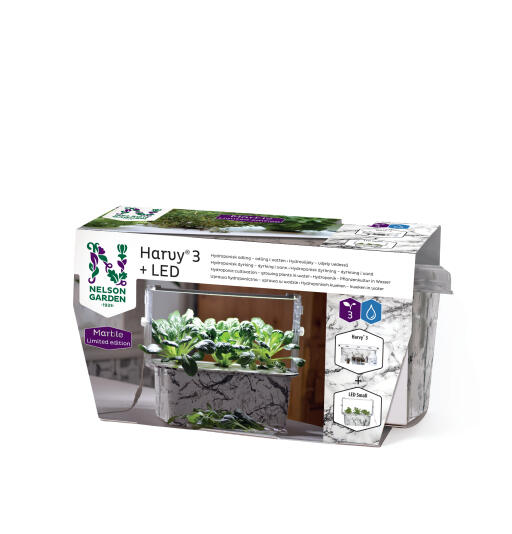 Marmormönstrad Harvy 3 med LED-ramp inkl. hållare som möjliggör valfri placering. En komplett lösning för hydroponisk odling där även växtnäring och försådda odlingspluggar ingår.