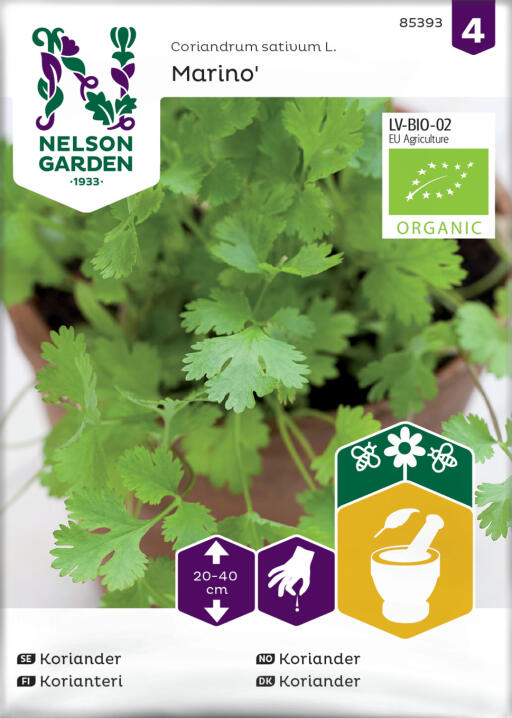 Ekologiskt frö. Koriander är en dekorativ kryddväxt. Så i omgångar för jämn tillgång. Sörda bladen efter hand. Fröna skördas genom att hela plantan klipps av och hängs upp och ner för att torka. Samla upp fröna och använd dem som krydda.