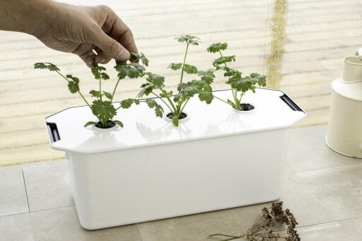 Jag gillar att variera lite vad jag odlar i Harvy under året men jag sår ofta samma sort i hela lådan, eller sorter som är redo att skördas ungefär vid samma tidpunkt. Till exempel olika sorters plocksallat och Pak Choi som är redo att skördas efter fyra veckor, eller olika kryddor som timjan, persilja och dill som jag börjar skörda av efter cirka sju veckor. När det gäller basilika, gurka och tomat, så sår jag dem oftast i separat