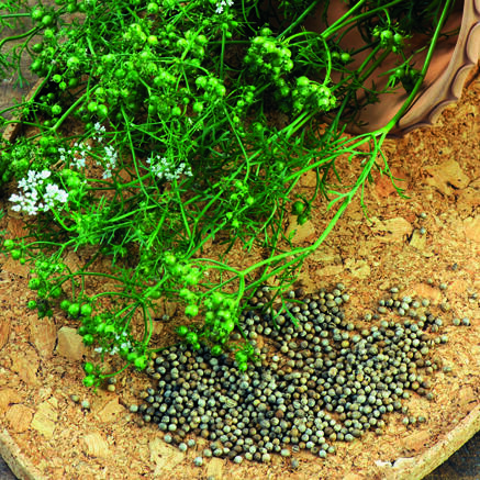 Orientalisk krydda, finns bl.a. i curry. De gröna bladen används färska i sallader och maträtter. Fröna används, skördas och torkas. Dekorativ växt med svagt rosa blommor. Trivs på de flesta jordar, gärna torr och lätt jord, skyddad växtplats.