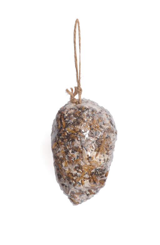 En dekorativ kotte fylld med talg, oljerika frön, majs samt proteinrika fluglarver ifrån svart soldatfluga. En annorlunda, men mycket näringsrik anrättning på småfåglarnas trädgårdsbuffé.