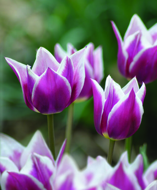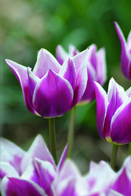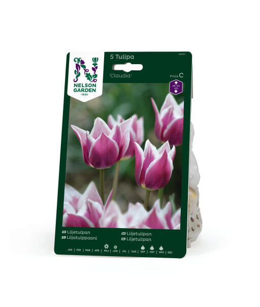 'Claudia' är en elegant och ståtlig liljeblommande tulpan på hög stjälk. Med sina vitkantade blomblad mot rödlila botten sticker den verkligen ut i rabatten. Utmärkt som snittblomma.