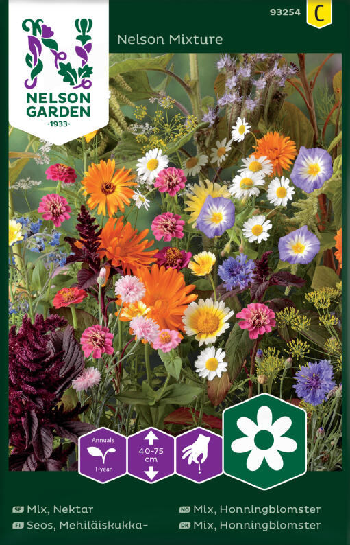 Nyttig och vacker blandning med utvalda sorter som ska locka till sig och ge nektar åt bin. Bin behövs för pollinering i trädgården. Innhåller bl.a. reseda, gurkört, honungsfacelia och praktmalva. Trivs på lucker mullrik jord, men flera sorter är anspråkslösa.