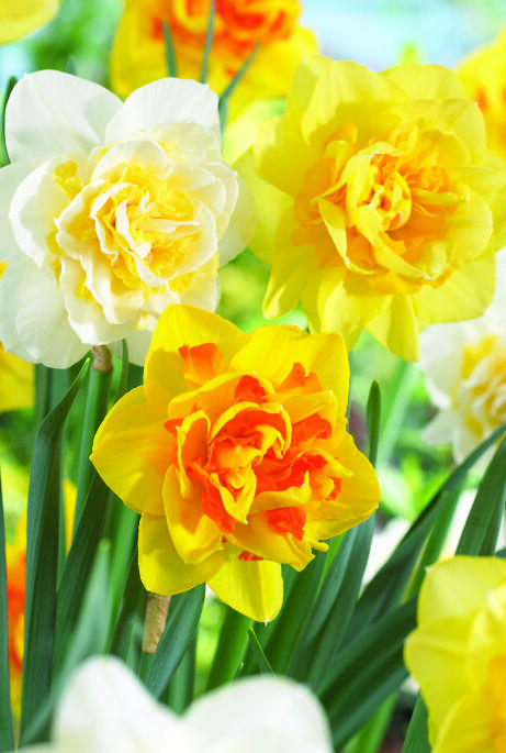 Tre storblommiga, fyllda och tåliga narcisser: Intill den prisbelönta, gyllengula Sherborne svänger Lingerie lekfullt sina vitgula underkjolar under Le Torch orangegula sken. Anses mindre smaklig för rådjur, hare, kanin och sork.