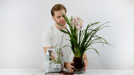 1. Plantera om orkidén när krukan är full eller rötter hänger över kanten. Gör det gärna under plantans viloperiod, när den inte har några blommor, och använd både inner- och ytterkruka.