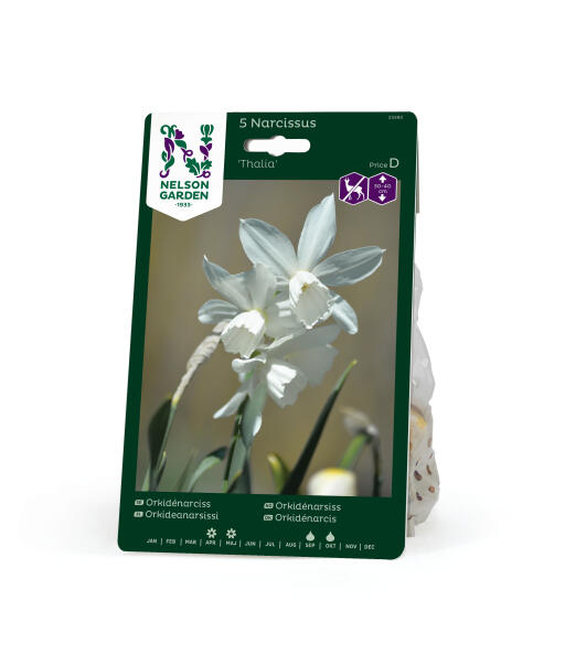 'Thalia' är en orkidénarciss och tillhör Triandrus-gruppen. Sorten har ett graciöst utseende med flera, rent vita, nickande blommor i toppen på varje stängel. Mycket söt i rabatten. Anses vara mindre smaklig för rådjur, hare, kanin och sork.