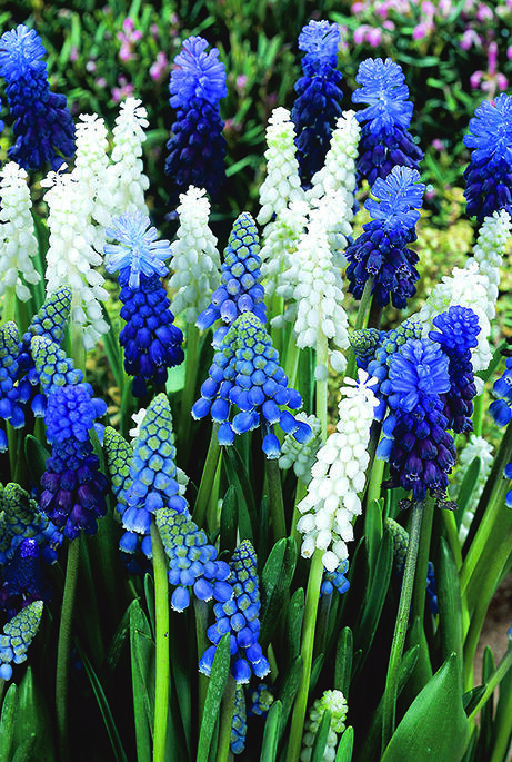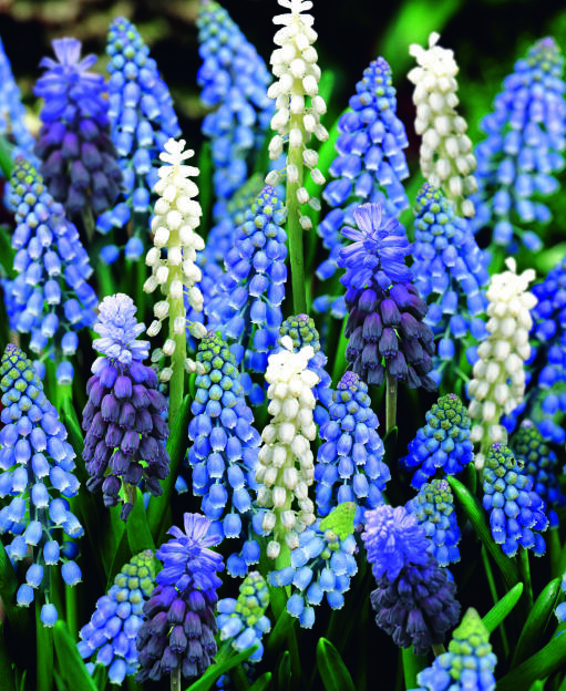 Lättodlade, rikblommande och alldeles, alldeles underbara! Med en färgskala som sträcker sig från rent vitt, över blått och mot mörkt violett, ger denna blandning av pärlhyacinter vårrabatten ytterligare en dimension.