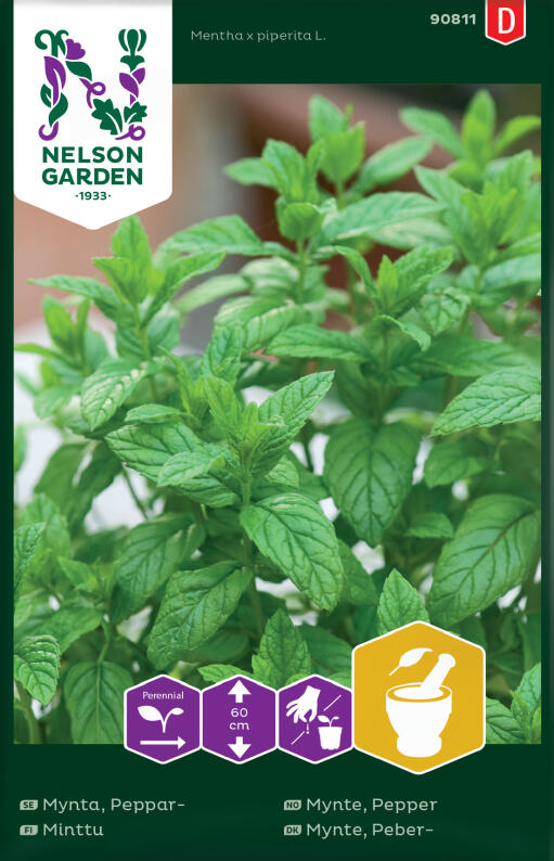 Starkt doftande, aromatiska blad som används färska eller torkade till te, sallader, såser, sötsaker, drinkar m.m. Bladen doftar och smakar starkt av pepparmyntsolja. Vackert gröna blad och fina lilarosa blomspiror. Anspråkslös och trivs på de flesta jordar.