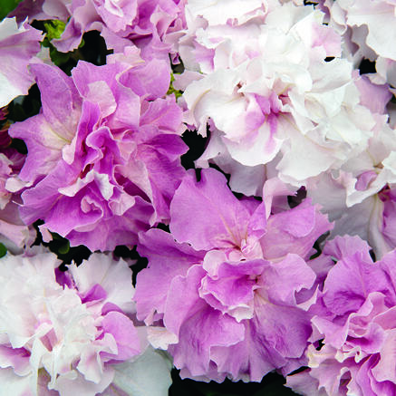 Petunia 'Double Cascade Orchid Mist' är en lättodlad sommarblomma. Den trivs i alla slags krukor och amplar i välgödslad jord. Sorten har stora uppåt 10 centimeter dubbla blommor med vågiga kanter. Blommorna är syrenrosa när de slår ut, och ljusnar vartefter blommorna mognar. Några av blommorna kan ha vita stänk. Petunia är en pålitlig sommarblomma då den är frisk, växer snabbt och blommar rikligt. Bladen är mörkt gröna och lite klibbiga. För att få maximal blomning, ställ plantan på en solig och vindskyddad plats. Blommorna är känsliga för regn. Plocka av vissna blommor vartefter så att plantan fokuserar på att bilda nya knoppar istället för frön. Plantera Petunia i välgödslad jord, och ge flytande gödning under blomningen.