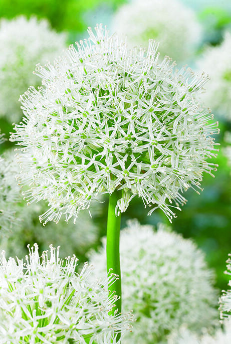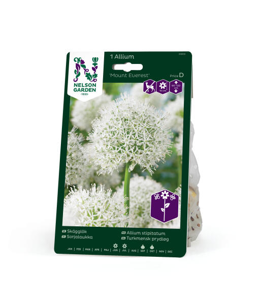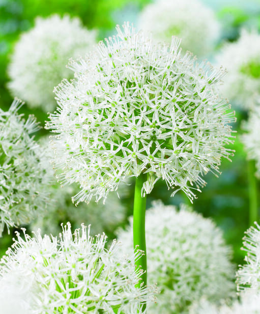 Praktfull jättelök med klotrunda, krämvita blomsamlingar likt svävande snöbollar i luften. De dekorativa bollarna, som består av små stjärnlika blommor, blir ca 15 cm i diameter. Anses vara mindre smaklig för rådjur, hare, kanin och sork.