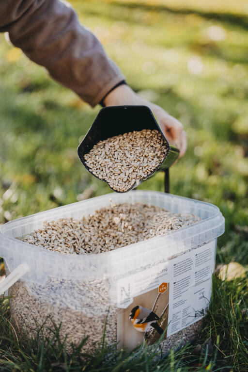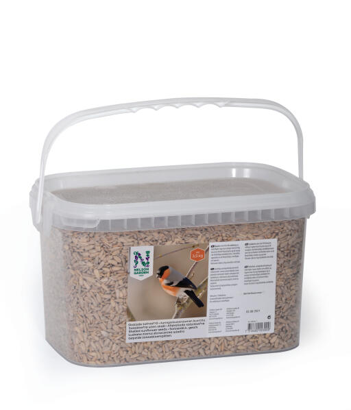 Skalade solrosfrön. Fåglarna kan direkt tillgodogöra sig all energi i de fetthaltiga solroskärnorna och inga skal skräpar ned på balkong eller i trädgård. Hink