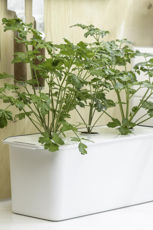 Jag gillar att variera lite vad jag odlar i Harvy under året men jag sår ofta samma sort i hela lådan, eller sorter som är redo att skördas ungefär vid samma tidpunkt. Till exempel olika sorters plocksallat och Pak Choi som är redo att skördas efter fyra veckor, eller olika kryddor som timjan, persilja och dill som jag börjar skörda av efter cirka sju veckor. När det gäller basilika, gurka och tomat, så sår jag dem oftast i separat