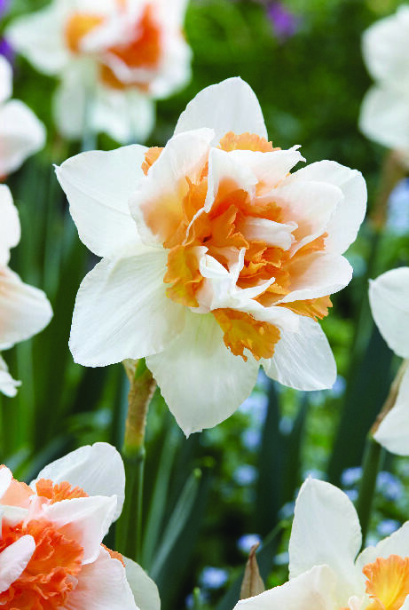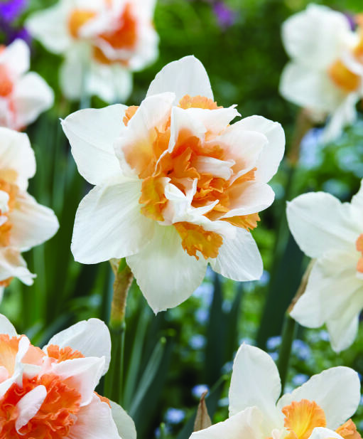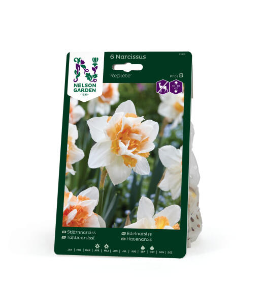 En elfenbensvit narciss till brädden fylld med en konstfullt veckad, dubbel trumpet i vitt, korallrosa och aprikos. Vacker som en dekorationsrosett i vårrabatten. Anses vara mindre smaklig för rådjur, hare, kanin och sork.