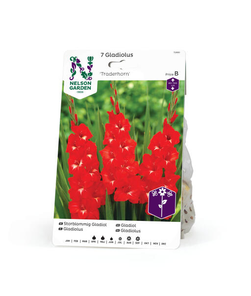 Storblommig gladiol av yppersta kvalitet. Skinande röda, eleganta blommor på höga stjälkar. Lämplig i rabatter, gärna flera i grupp. Även i stora krukor och framförallt fantastisk i maffiga buketter.