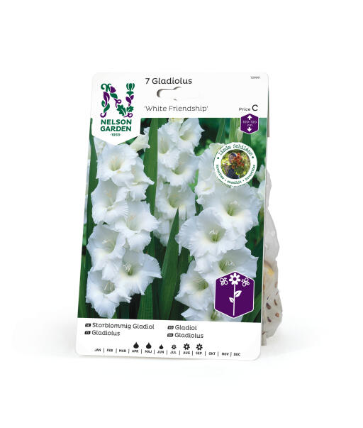 'White Friendship' är en storblommig gladiol av hög kvalitet. Utmärkt att använda som snittblomma, bör då skördas när den nedersta blomman börjat slå ut. Kan behöva bindas upp något.