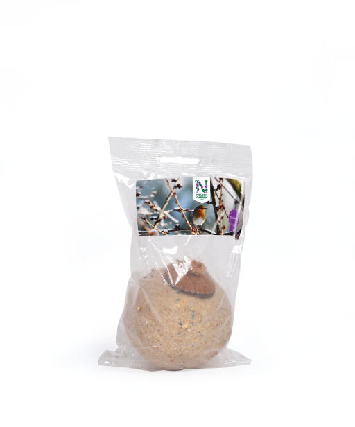 Stor talgboll utan nät för utfodring av vildfågel. Fäst på en kokosplatta med snöre och kan direkt hängas på en gren eller en fågelmatarstation. Energirikt innehåll av fetthaltiga fröer, talg och spannmål. 500 g