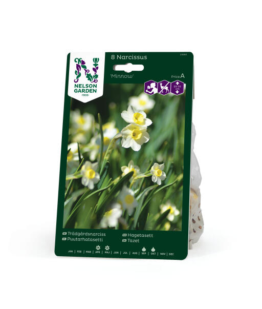 'Minnow' är en trädgårdstazett som får två eller flera små doftande blommor på varje stängel. Kalkbladen är ljust gula och bikronan är mörkare gul. Söt både i rabatten och i krukor. Anses vara mindre smaklig för rådjur, hare, kanin och sork.