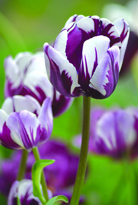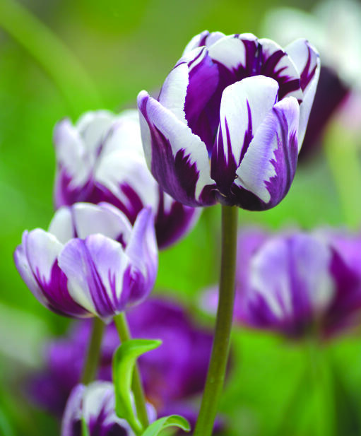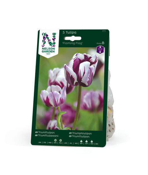 Ja, nog skulle väl denna ståtliga triumftulpan kunna liknas vid en flammande flagga som vajar i vinden i lila och vitt. Blommar länge och är lika hållbar i rabatten som i den eleganta vårbuketten.