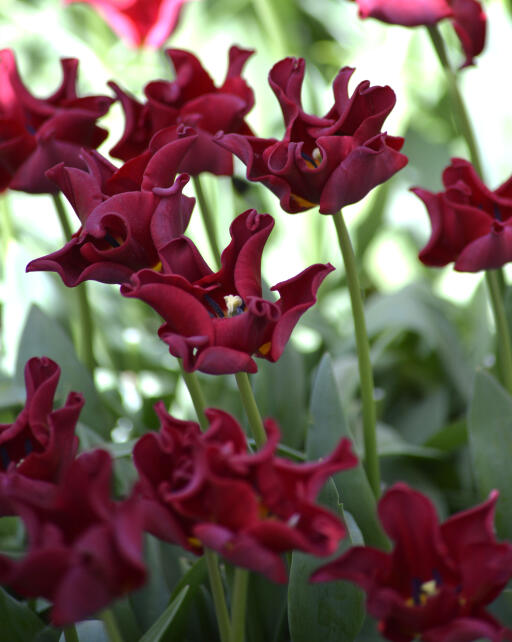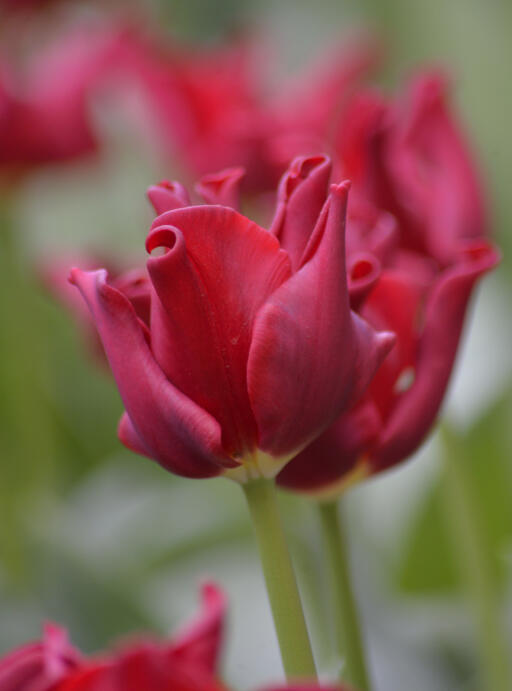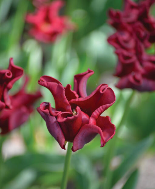 Röd och rebellisk – denna elegenta triumftulpan blir något alldeles särskilt i rabatten med sina kronliknande blomblad.
