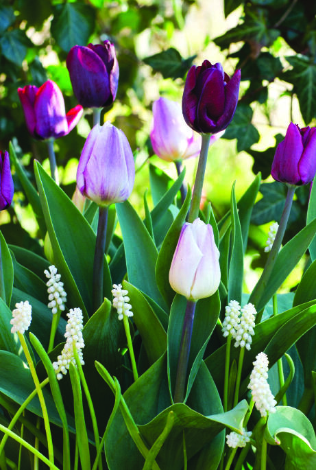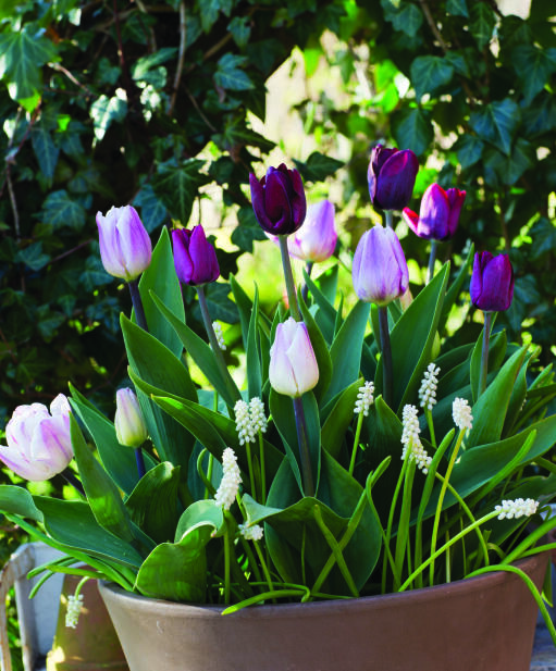 En välavvägd färgkombination från dovt vinrött, över lilarosa toner till vitaste vitt. Tulpanernas klassiska blomform framhävs fint av pärlhyacintens druvklasar av kritvita blommor. En stilren kombination för rabatt och kruka.