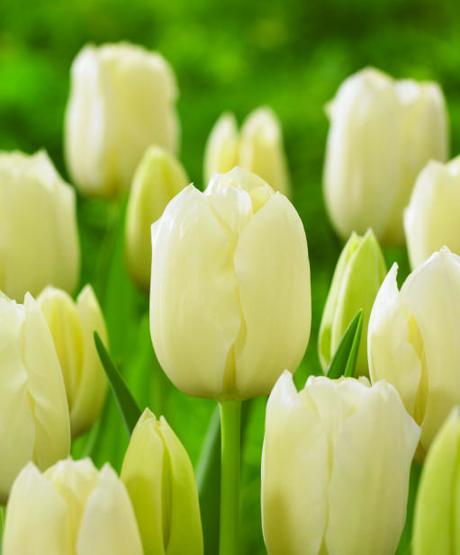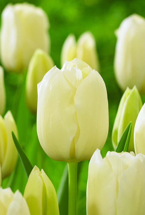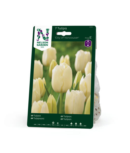 En ståtlig tulpan som höjer sig över rabatten och blommar länge. Framtagen för sin elegans och sin hållbarhet som snittblomma. De elfenbensvita kronbladen har en fjäderlätt teckning i gult som bleknar efter hand.