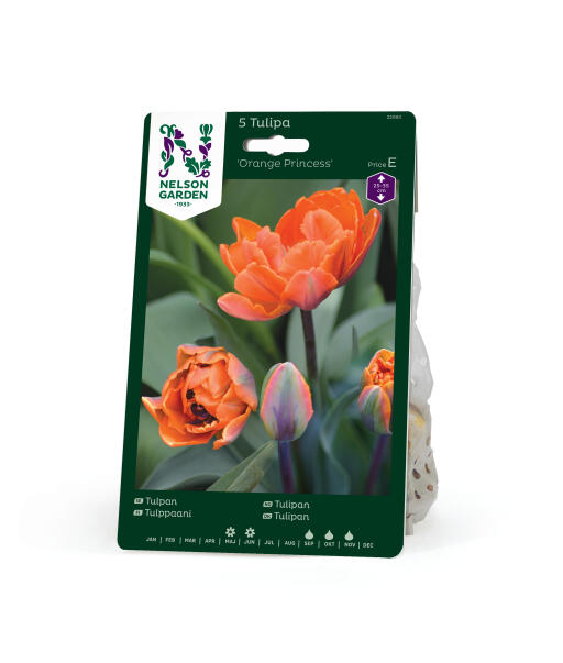 En två gånger prisbelönt skönhet som behåller lite av knoppens gröna färg när den öppnar sina lager av orange kronblad. En välfylld och doftande, pionlik tulpan med rödvioletta strimmor på de yttre kronbladen. Passar utmärkt i kruka.