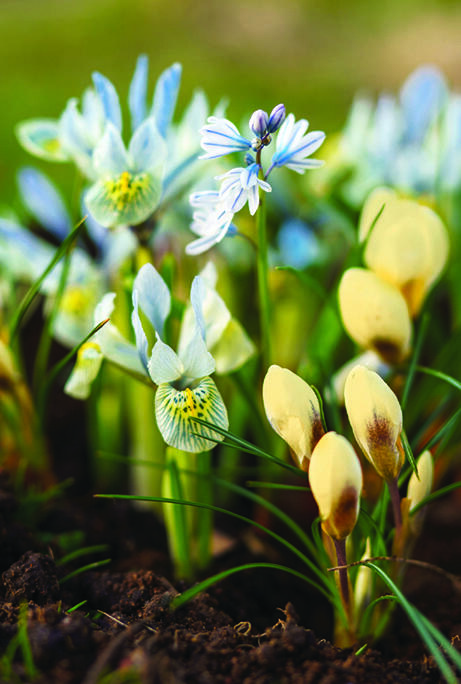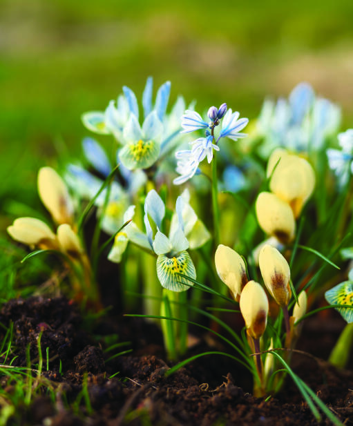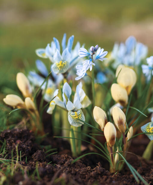 Vårens första skönheter för rabatt och kruka. Våririsens ljusblå färg är nästan självlysande och kompletteras av porslinshyacintens skira blommor i samma nyans, medan det djärva gula mönstret matchas av krokusens mjuka gula toner.