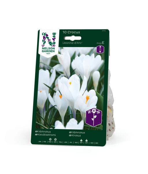 'Jeanne d'Arc' är en vårkrokus med stora vackert vita blommor. Bland krokusarna har vårkrokusen de största blommorna. Passar fint förutom i rabatten, i kanten av buskar och häckar och framför träd där vårsolen lyser.